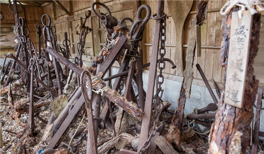 「漁師さんが網を引くでしょう。そうして海に沈んでいる錨が網にかかったら、引き上げてここに奉納して、お祓いを受けるんです。それから金物除けと言って、漁に出て、船から誤って包丁とかの金物を海に落としたら、すぐに漁を止めて神社に来てお祓いを受けるんです。なぜかというと、辰や巳が水の神様でもあるんですが、辰や巳の神様は金物を嫌うんですよ。海に落としたら神様が怒るから。お祓いを受けて怒りを沈めないといけないんです。海は大切な仕事場ですからね」